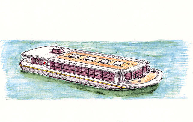 東京湾の夜に彩りをそえる屋形船、その外観をクルーザー風にしたわけです。 内装は好みによりますがたたみに総ひのき造り。 そして春のお花見や夏の花火には屋根に上がって楽しめるように・・・そんなデザインにしました。